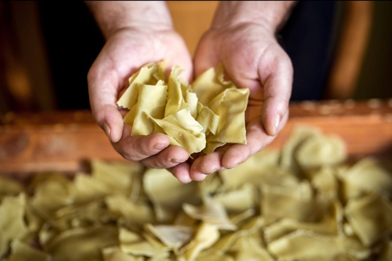 Η αληθινή μαγεία, όμως, ξεκινά μόλις καθίσεις. Ο σερβιτόρος φέρνει μπροστά σου έναν ξύλινο δίσκο γεμάτο χειροποίητη πάστα. Κάθε επιλογή είναι και μια μικρή ιστορία: από τα βελούδινα fettuccine μέχρι τα στιβαρά casarecce, κάθε ζυμαρικό φτιάχνεται καθημερινά με αγάπη και προσοχή. Την ημέρα εκείνη, διάλεξα τα pappardelle — φαρδιές κορδέλες ζυμαρικών που φάνταζαν ιδανικές για τον καιρό.