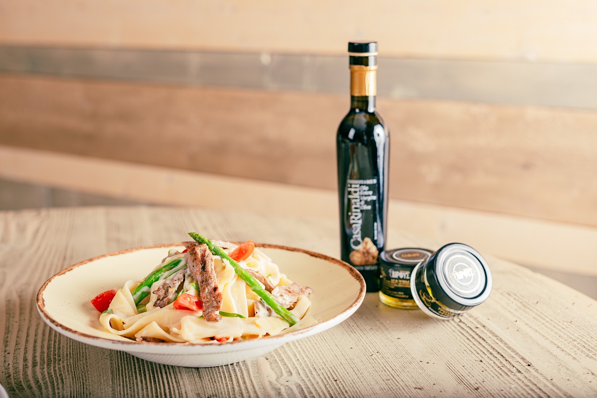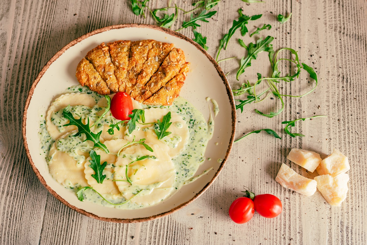 Σειρά μετά την πίτσα έχει κλασικά η pasta, όπου δοκιμάσαμε Pappardelle “Due Pentole” με τις al dente παπαρδέλες να σερβίρονται με λεπτές φέτες από picanha, σπαράγγια και ντοματίνια, ενώ η σάλτσα άσπρης τρούφας δίνει το απόλυτο άρωμα Ιταλίας στο πιάτο. Αλλά επειδή ένα πιάτο ζυμαρικών δεν είναι ποτέ αρκετό, επιλέξαμε και τα χειροποίητα ραβιόλι τους, με γέμιση από μους παρμεζάνας, που σερβίρονται παρέα με τραγανό φιλέτο κοτόπουλο με κρούστα από ξηρούς καρπούς και ταιριαστό pesto ρόκας.