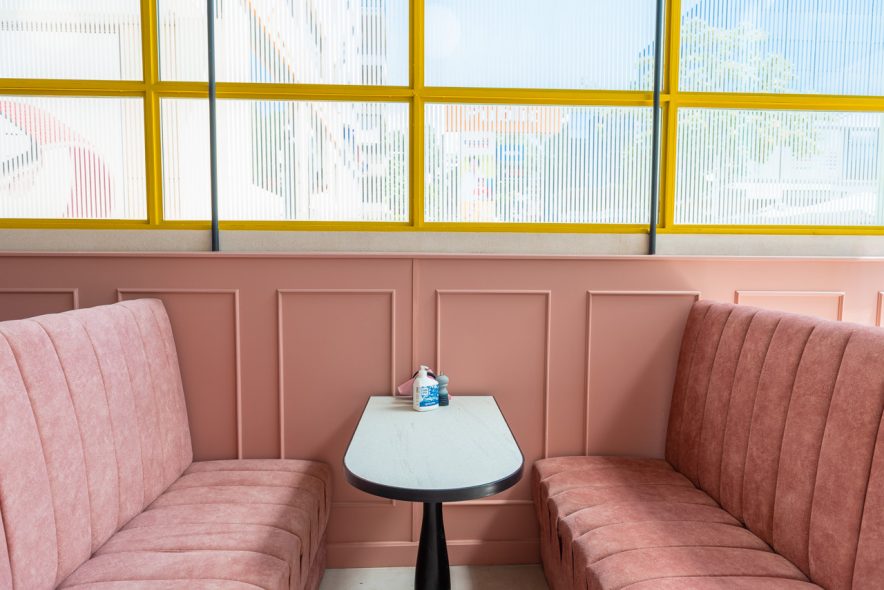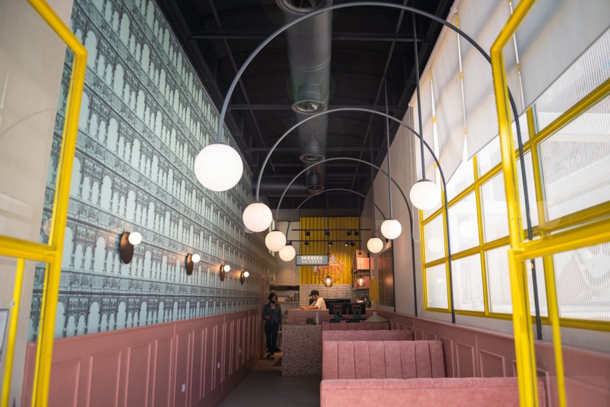 Ο μακρόστενος, πολύ ιδιαίτερος χώρος στους χρωματικούς τόνους του dusty pink μας βγάζει μια γλυκιά οικειότητα, σαν να βρισκόμαστε στο σπίτι κάποιου φίλου από την Ιταλία που μαγειρεύει αποκλειστικά για μας (Mama Mia!).