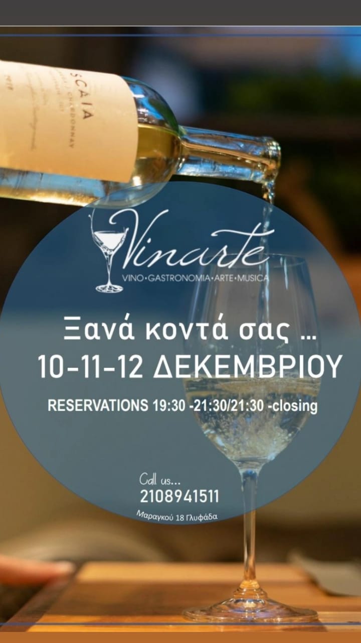 Το Vinarte, το αγαπημένο wine bar restaurant της Γλυφάδας που λατρεύουμε να επισκεπτόμαστε τον χειμώνα, επιστρέφει και πάλι κοντά μας. Συγκεκριμένα, στις 10, 11 και 12 Δεκέμβρη, μας περιμένει με ανυπομονησία για να απολαύσουμε ξανά αυθεντική ιταλική κουζίνα στον ατμοσφαιρικό και cozy χώρο του, παρέα φυσικά με το εξαιρετικό κρασί του, από εκλεκτές ετικέτες.