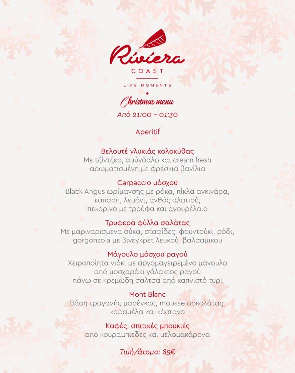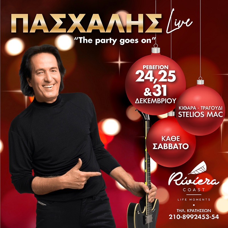 Σε μία μοναδική τοποθεσία, ακριβώς επάνω από τη θάλασσα, με υπέροχη θέα, διακριτική πολυτέλεια και γεύσεις που κερδίζουν και τους πλέον απαιτητικός, το Riviera Coast στη Βούλα είναι από τους πιο αγαπημένους προορισμούς των νοτίων προαστίων. Εδώ η κάθε έξοδος είναι ξεχωριστή και οι ημέρες των γιορτών δεν θα μπορούσαν να αποτελούν εξαίρεση. Για την βραδιά των Χριστουγέννων λοιπόν, το Riviera Coast έχει μια νόστιμη πρόταση, σερβίροντας ένα εορταστικό μενού ειδικά σχεδιασμένο για αυτή τη βραδιά, ενώ ο Πασχάλης συνεχίζει να κρατάει τη διασκέδαση στα ύψη, με ένα ακόμη ξεχωριστό live.