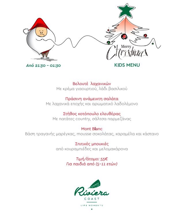 Για τα παιδιά ηλικίας 5 έως 11 ετών, σερβίρεται ξεχωριστό kids’ menu για την ημέρα των Χριστουγέννων, με βελουτέ λαχανικών με κρέμα γιαουρτιού και λάδι βασιλικού, πράσινη ανάμεικτη σαλάτα με λαχανικά εποχής και αρωματικό λαδολέμονο, στήθος κοτόπουλο ελευθέρας βοσκής με πατάτες country και σάλτσα παρμεζάνας για κυρίως και για το τέλος, Mont Blanc με βάση τραγανής μαρέγκας, mousse σοκολάτας, καραμέλα και κάστανο, αλλά και σπιτικές μπουκιές από μελομακάρονα και κουραμπιέδες.