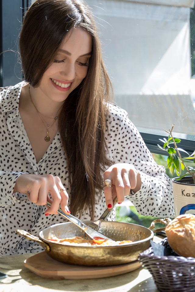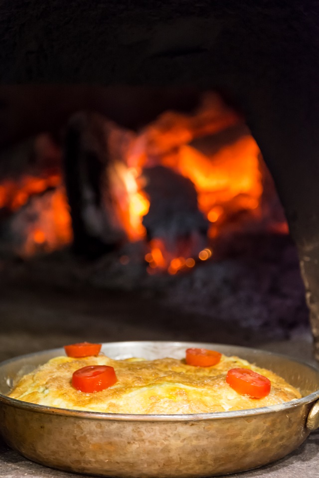 Μιας και ήταν ακόμη πρωί και η συζήτηση με την Φοίβη είχε ακόμη πολύ δρόμο, δώσαμε στους εαυτούς μας το ελεύθερο να κάτσουμε στον καλαίσθητο (φωτεινό και μεγάλο) μπροστινό χώρο του και να παρατείνουμε λίγο παραπάνω το ευχάριστο αυτό διάλειμμα από τις υποχρεώσεις μας, παραγγέλλοντας μια ομελέτα από το μενού πρωινού του. Η αλήθεια είναι ότι περιμέναμε κάτι απλό & απέριττο. Αυτό που τελικά μας ήρθε στο τραπέζι, σερβιρισμένο σε ένα τσίγκινο μπολάκι, κατευθείαν από τον ξυλόφουρνο, μαζί με ντοματίνια, σπανάκι, μπέικον και μανιτάρια, ήταν εξαιρετικό. Ο ίδιος ξυλόφουρνος, κάνει το παραπάνω καλτσόνε, τις πίτσες που θα βρεις στην βιτρίνα αλλά και τα περισσότερα πρωινά που θα βρεις στον κατάλογο του Kazarte.