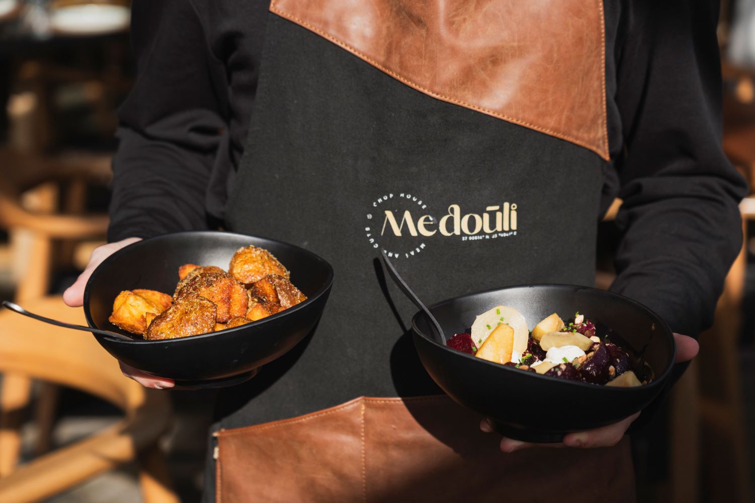 Το όραμα του Γιάννη Μουζακίτη, όταν έφτιαχνε το Medouli, δεν ήταν απλώς να φτιάξει ένα εστιατόριο για κρέας, αλλά να δημιουργήσει γύρω από το καλό κρέας ένα ταξίδι γεύσεων που να το συμπλήρώνει και, τελικά, να το απογειώνει. Ο σεφ, που μεγάλωσε μέσα στην κουλτούρα της εστίασης (ο μπαμπάς του είχε αλυσίδα ψητοπωλείων) και σπούδασε μαγειρική με εξειδίκευση στο κρέας, ονειρεύτηκε παράλληλα να φτιάξει έναν χώρο που να παντρεύει το παραδοσιακό με το σύγχρονο, από όλες τις απόψεις.