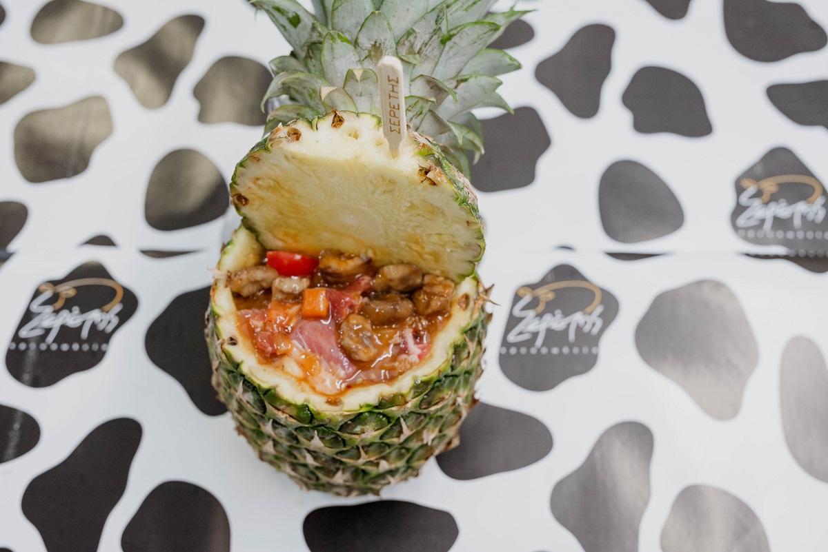 Αγαπημένη επιλογή για τα γιορτινά τραπέζια όμως, είναι και το χοιρινό, που μας προτείνουν να το βάλουμε στο τραπέζι μας είτε ως γεμιστό καρέ σε μαρινάδα μπύρας, που στη μία πλευρά έχει γέμιση από τυρί κρέμα και καπνιστό μπέικον και στην άλλη τσένταρ, είτε ως γλυκόξινο χοιρινό μέσα σε ανανά! Σωστά διάβασες, το γλυκόξινο χοιρινό δεν είναι απλά με ανανά, αλλά το αγοράζεις μέσα σε ανανά και έτσι θα το βάλεις να ψηθεί και στον φούρνο, τυλίγοντας απλά εξωτερικά το φρούτο με αλουμινόχαρτο. Εντυπωσιακό, έτσι;