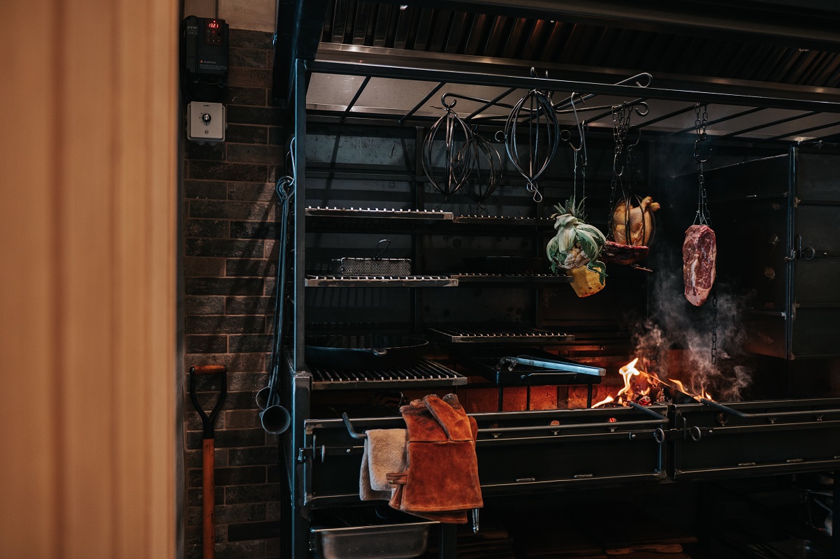 Επόμενος σταθμός η ανοιχτή κουζίνα του εστιατορίου («δεν έχουμε κάτι να κρύψουμε», μου λέει χαρακτηριστικά), όπου τα επιλεγμένα κρέατα σιγοψήνονται σε ωριμασμένα ξύλα ελιάς, οξιάς και σφενδάμου. Το καθένα τους έχει τα δικά του αρώματα και χαρακτηριστικά, που εξυπηρετούν διαφορετικούς, αλλά εξίσου «αμαρτωλούς» γευστικά σκοπούς. «Το ξύλο είναι μια φυσική ύλη που δεν έχει υποστεί επεξεργασία», σημειώνει ο εμπνευστής του κομψού χώρου. «Δεν έχει χημικά ή άλλες ουσίες και στη γεύση έχει τεράστια διαφορά, δεν χρειάζεται ειδικές γνώσεις για να το καταλάβεις. Όλοι ξέρουμε πόσο διαφορετικό είναι το ψωμί από ξυλόφουρνο, η πίτσα, ακόμη και το γιουβέτσι. Το ίδιο ισχύει και για το κρέας. Κανείς δεν ξεχνά το ιδιαίτερο αποτέλεσμα που δίνει το ξύλο και αυτό το κάνει τόσο μοναδικό».