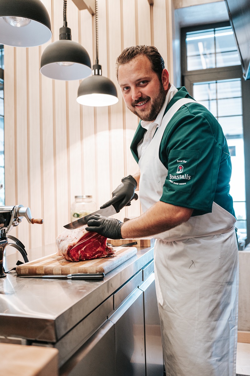 Υπεύθυνος γι’ αυτόν τον παράδεισο των κρεατοφάγων ο Γιάννης Beastalis (κατά κόσμον Μπασταλής) με μακρά προσωπική εμπειρία και βαθιές γνώσεις στον χώρο. Αφού σπούδασε ανατομία του κρέατος, εργάστηκε σε Ελλάδα, Αγγλία, Αυστραλία, Τουρκία (στο πρώτο εστιατόριο του πιο διάσημου στην Ελλάδα τούρκου σεφ, του οποίου υπήρξε και head butcher αργότερα στη Μύκονο) και κατέκτησε παγκόσμιους διαγωνισμούς -το μπιφτέκι που σερβίρει στο νέο του εστιατόριο έχει κατακτήσει το πρώτο βραβείο γεύσης στο World Butcher Challenge-, ο Beastalis επέστρεψε στη γειτονιά του. Εκεί, προσφέρει μέσα από το ομώνυμο εστιατόριο αυτό που γνωρίζει καλύτερα: ιδιαίτερες κοπές, απαιτητικές τεχνικές ψησίματος και μια διαδραστική γαστρονομική εμπειρία που απευθύνεται σε όλες τις αισθήσεις.