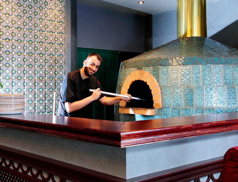 Εντυπωσιακό αξιοθέατο -κυριολεκτικά- είναι και ο πετρόχτιστος ξυλόφουρνος επενδεδυμένος με ψηφιδωτά πλακάκια όπως και οι τοίχοι.