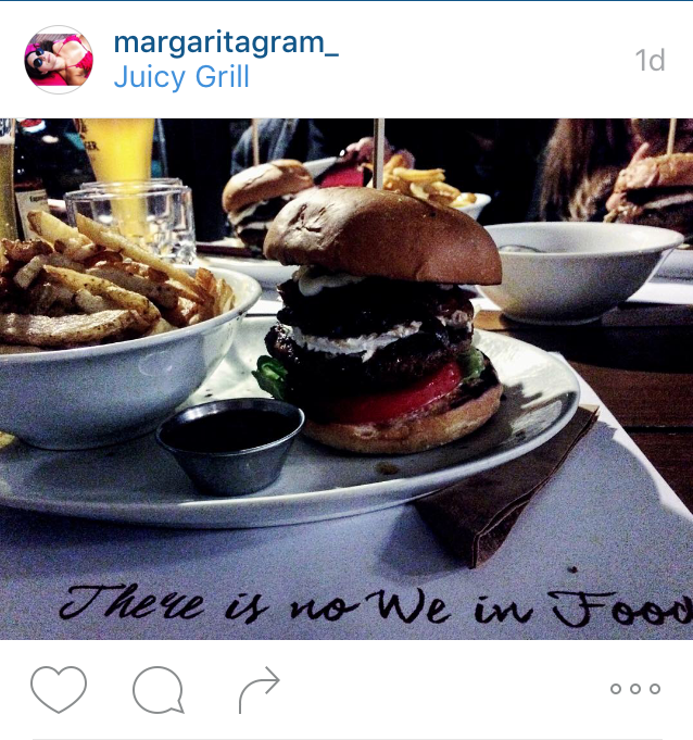 Κοιτάζοντας τον κατάλογο, διαλέξαμε μερικά φαβορί. Τις πατάτες με τον κιμά, τα onion rings και τα chicken fingers για ορεκτικά. Σαλάτα; Μπα, κρίμα είναι, δεν θα την έτρωγε και κανείς. Γυρνώντας, τα μπέργκερς. Ενώ όμως, το προσπαθήσαμε πολύ να πάρουμε κάτι διαφορετικό, δεν μας άφησε το στομαχί μας, με triggering point την ατάκα της μιας φίλης μου “Γιατί να πάρουμε διαφορετικά ρε Μαργαρίτα; Αφού δεν πρόκειται να τα μοιραστούμε, το λέει και στο χαρτί”. Πολύ μπροστά το Juicy Grill λέγοντάς σου πριν παραγγείλεις “There is no we in food”. Όπως και η φίλη μου που ήξερε πως θα γινόταν μάχη.