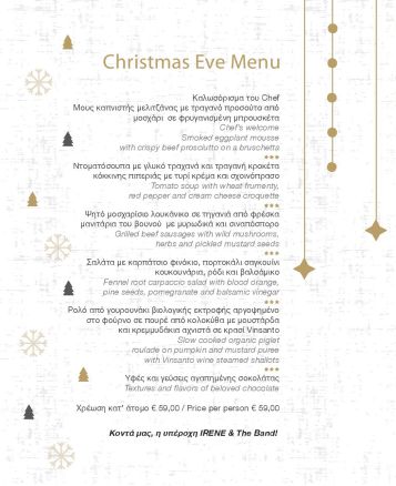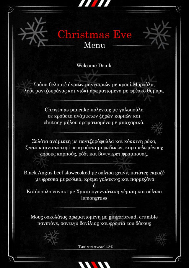 Η βραδιά ξεκινάει μ’ ένα welcome drink, ειδικά σχεδιασμένο για εκείνη αλλά και για εκείνον. Η διάθεση ανεβαίνει και όλα είναι έτοιμα για να ξεκινήσει το χριστουγεννιάτικο ρεβεγιόν. Το μενού προβλέπεται απολαυστικό και ο σεφ του Bella Vespa έχει ετοιμάσει μια πολύ ιδιαίτερη πρόταση, αποκλειστικά για τα Χριστούγεννα. Πρώτο πιάτο, σούπα βελουτέ μανιταριών με αφρό παρμεζάνας. Ακολουθεί η σαλάτα με ανάμεικτα φύλλα σαλάτας με ρόδι, κουκουνάρι, κατσικίσιο τυρί και dressing εσπεριδοειδών. Και το λαχταριστικό ορεκτικό που είναι ένα pate μωβ πατάτας με χοιρινό iberico και σάλτσα peperoncino που δε θέλεις να τελειώσει! Πάυση για ένα sorbet lime για να καθαρίσει η παλέτα μας και να υποδεχθεί το κυρίως πιάτο. Ένα επιβλητικό δηλαδή -και αυθεντικά ιταλικό- οσομπούκο με πουρέ porchini και φρέσκια τρούφα που είναι η μεγάλη απολαυστική έκπληξη της γιορτινής βραδιάς. Όσον αφορά το γλυκό, αυτό γεμίζει το στόμα σου και μόνο που το προφέρεις, δηλαδή μια λαχταριστή μους κάστανο πάνω σε τραγανό μπισκουί gianduja, μύρτιλο και σάλτσα tayberry.