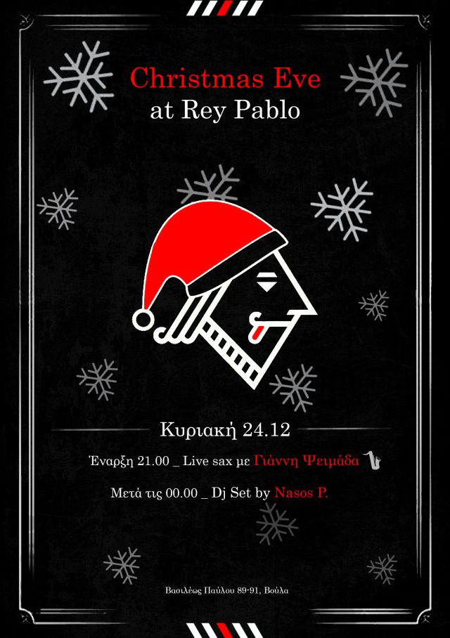 Το αγαπημένο νότιο στέκι, που πάντα έχει μία έκπληξη για εμάς. Άλλοτε γευστική και άλλοτε μουσική. Αυτή τη φορά συνδυάζει και τις δύο για μία πολύ ιδιαίτερη μέρα, όπως είναι η Παραμονή Χριστουγέννων. Εκεί λοιπόν που πήγαινες τις Κυριακές για brunch με φίλους στο Rey Pablo, ο σεφ σού προτείνει τώρα να επισκεφθείς το στέκι σου για το χριστουγεννιάτικο ρεβεγιόν. Και για να έχεις την απόλυτη γευστική εικόνα… Σούπα βελουτέ άγριων μανιταριών με κρασί Μαρσάλα λάδι ματζουράνας και νιόκι με φρέσκο θυμάρι, Black Angus beef slowcooked με σάλτσα gravy πατάτες εκραζέ με φρέσκα μυρωδικά, κρέμα γάλακτος και παρμεζάνα, κοτόπουλο νανάκι με χριστουγεννιάτικη γέμιση και σάλτσα lemongrass, μους σοκολάτας αρωματισμένη με gingerbread, crumble πανετόνε, σαντιγύ βανίλιας και φρούτα του δάσους. Όλη αυτή η εικόνα τώρα θα γίνει στην πραγματικότητα ακόμη πιο δυνατή και ατμοσφαιρική χάρη στο σαξόφωνο του Γιάννη Ψειμαδά. Και για το τέλος, επειδή όλοι έχουμε μία διάθεση για «little party» αυτές τις ημέρες, μετά τις 12.00 ο DJ Nassos P. θα είναι εκεί για εμάς και την παρέα μας!