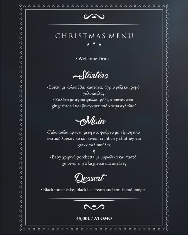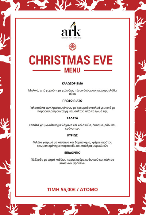 Το χριστουγεννιάτικο καλωσόρισμα στο Ark γίνεται με μπλινίς από χαρούπι με χαλούμι, πέστο δυόσμου και μαρμελάδα σύκο. Το πρώτο πιάτο του γιορτινού μενού διατηρεί το εθιμοτυπικό της γαλοπούλας, με μία γευστική διαφοροποίηση χάρη στον κρεμμυδοντολμά που τη συνοδεύει. Συνεχίζουμε με μία σαλάτα “στα κόκκινα” με ρόδι, λάχανο και cranberry. Το κυρίως πιάτο είναι φιλέτο χοιρινό με κάστανα και δαμάσκηνα, κρέμα καρότου αρωματισμένη με πορτοκάλι και πούδρα μυρωδικών. Αυτό που μας αρέσει στο συγκεκριμένο γιορτινό μενού είναι ότι συνδυάζει τις παραδοσιακές χριστουγεννιάτικες συνταγές που από μικρά παιδιά περιμένουμε πως και πως τις συγκεκριμένες ημέρες με τις πιο gourmet πινελιές…