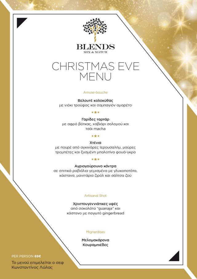Αν επιλέξεις να περάσεις το Χριστουγεννιάτικο ρεβεγιόν στο Blends, θα έχεις τη μοναδική ευκαιρία να γευτείς τα ευφάνταστα πιάτα και τους εξαιρετικούς συνδυασμούς γεύσεων που έχει δημιουργήσει ο σεφ Κωσταντίνος Λώλας, συνοδευόμενα από μια πλούσια λίστα κρασιών που ικανοποιεί ακόμα και τους πιο απαιτητικούς ουρανίσκους. Παράλληλα, το Blends παραμένοντας πιστό στη φιλοσοφία του, εξασφάλισε για τους καλεσμένους της βραδιάς ένα πολύ ξεχωριστό live performance. Ο De Baron, κατά κόσμο Γιάννης Σκουλάς, θα πλαισιώσει μοναδικά τις δυο αυτές γιορτινές ημέρες ερμηνεύοντας ένα πρόγραμμα με διασκευές αγαπημένων μελωδιών, συνδυασμένο μοναδικά στον ατμοσφαιρικό χώρο του Blends. Από την soul στην opera και από την pop jazz στο cabaret του 2000, ο De Baron υπόσχεται να απογειώσει την εορταστική διάθεση. Μαζί του μια εξαίρετη ομάδα μουσικών, οι “Electro Quartet” που απαρτίζεται από τους: Χρήστος Θεοδώρου – πιάνο -ενορχηστρώσεις, Αγγελική Ποτήρη – βιολί, Πέτρος Κρεμυζάκης – μπάσο και Ρόλη Γιαμοπούλου – τύμπανα. Τις βραδιές θα ντύσει με εικόνα, (live projection) ο σκηνοθέτης Λεωνίδας Κεχαγιάς.