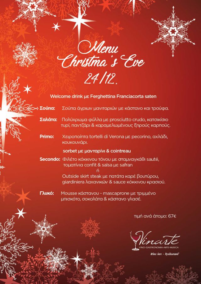 Μπορεί φέτος να μην πρόλαβες να διοργανώσεις το ταξίδι που ήθελες να κάνεις τα Χριστούγεννα, αλλά μη στενοχωριέσαι. Με το που θα φορέσεις τα καλά σου και θα μπεις στο εστιατόριο- wine bar Vinarte την Παραμονή των Χριστουγέννων, θα αισθανθείς ότι έχεις τρυπώσει σ’ ένα διάσημο ιταλικό spot… Η αίσθηση αυτή προκύπτει από την εκπληκτική ιταλική κουζίνα, την ποικιλία σε καλό κρασί (με προσεκτικά επιλεγμένες ετικέτες από όλο τον κόσμο), τα αντικέ έπιπλα και τα έργα τέχνης που υπάρχουν γύρω σου. Όσο για το μενού; Σούπα άγριων μανιταριών με κάστανο και τρούφα. Σαλάτα με άριστης ποιότητας ιταλικό προσούτο και κατσικίσιο τυρί, χειροποίητα tortelli di Verona (σου είπαμε, ταξιδεύεις Ιταλία τώρα!) με αχλάδι και κουκουνάρι, μους κάστανου μασκαρπόνε με τριμμένο μπισκότο, σοκολάτα και κάστανο γλασέ.