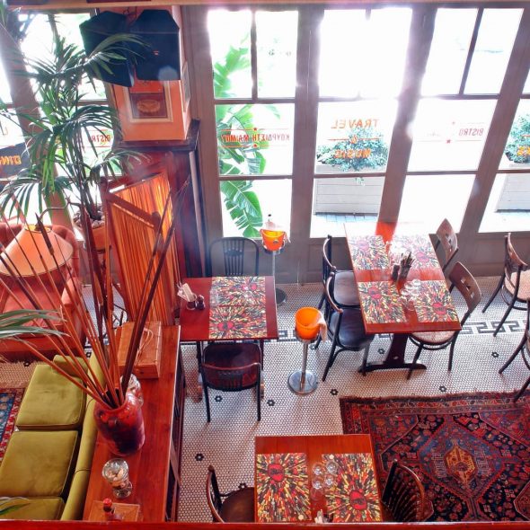 Ο χώρος απηχεί τη μεγάλη του αγάπη για τα ταξίδια, τόσο στη διακόσμηση –από τα τραπέζια-βαλίτσες και τα βαλσαμωμένα ζώα στους τοίχους μέχρι τα χειροποίητα χαλιά και τα πολλά δικά του αντικείμενα από διάφορα ταξίδια στην Ασία και την Αφρική- όσο και στην κουζίνα που «τσιμπολογάει» γεύσεις από διάφορες κουλτούρες.