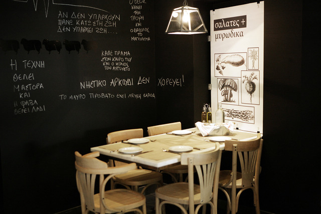 Ελληνικό μεζεδοπωλείο στην πιο μοντέρνα βερσιόν που έχεις στο μυαλό σου. Οι τοίχοι είναι υπερσικάτοι. Μαύροι με γραμμένες πάνω παροιμίες σχετικές με το φαγητό (και όχι μόνο). Τις νοστιμιές τους θα σου τις σερβίρουν σε μικρά πιατάκια, για να μπορείς να δοκιμάσεις λίγο από όλα. Ποια όλα; Γαύρο σε κριθαροκουλούρες με μαριναρισμένη ντομάτα, αρνάκι γάλακτος στη λαδόκολλα με φρεσκοκομμένες τηγανιτές πατάτες και μυρωδικά, κατίκι Δομοκού. Φαγητό από Ελλάδα, που το ξέρεις και το εμπιστεύεσαι ρε αδελφέ, αλλά μαγειρέμενο με τρόπο πρωτοποριακό. Για το τέλος σου άφησα το τρομερό σπιτικό κέικ καρότου. Ουάου.