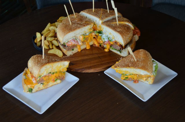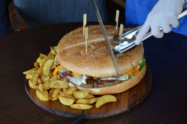 Ήταν ίσως ότι πιο προκλητικό έχω δει σε burger. Όχι μόνο λόγω μεγέθους, αλλά περισσότερο λόγω των ζουμερών συστατικών που έτρεχαν πρόστυχα. Τσένταρ, μαγιονέζα, bacon όλα μαεστρικά τοποθετημένα πάνω σε 1.800 γραμμάρια μπιφτεκιού και σκεπασμένα από ένα τεράστιο και αφράτο ψωμί.