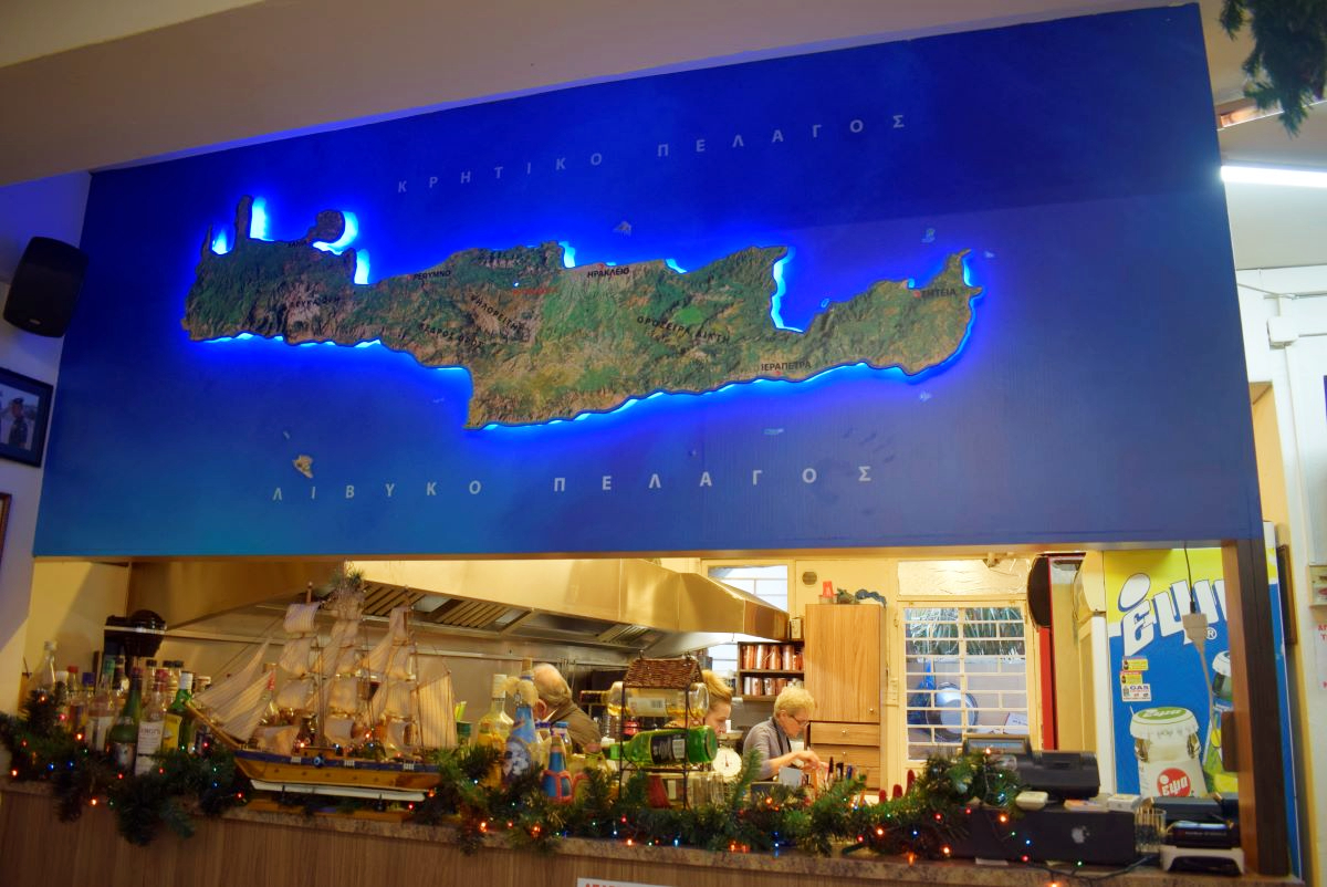 Απέναντι ακριβώς, η ανοιχτή κουζίνα με προϊδέαζε για το τι θα επακολουθήσει, αφού μυρωδιές ταξίδευαν μέχρι την είσοδο του μαγαζιού. Σε έναν τοίχο, πάνω από την κουζίνα, ένας χάρτης της Κρήτης με δυνατό νέον σού τονίζει τις ρίζες του μαγαζιού, ενώ γυρνώντας το βλέμμα λίγο προς τα δεξιά, βλέπω δύο τηλεοράσεις που παίζουν ταυτόχρονα -η μία ειδήσεις, η άλλη κρητικούς χορευτές με φόντο το άγριο τοπίο του νησιού. Και αυτά δίπλα σε μία φωτογραφία του Ξυλούρη, την οποία για κάποιο λόγο νόμιζα ότι μπορούσα απλά να κάθομαι και να την χαζεύω για αρκετή ώρα.