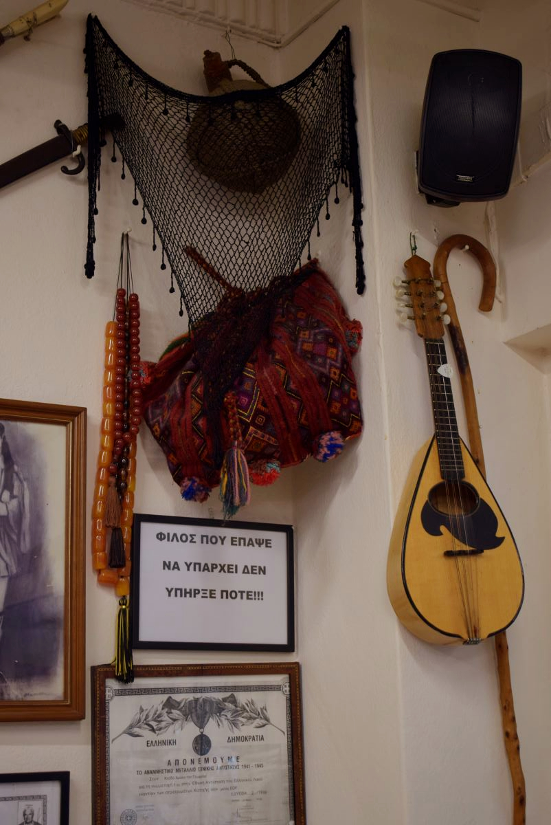 Βλέποντας το μαγαζί απ’ έξω, σκέφτηκα ότι πρόκειται για ένα κλασικό καφενείο, όπως πολλά που συναντάς σε διάφορες αθηναϊκές συνοικίες. Ωστόσο, μπαίνοντας μέσα, δεν άργησα να διαπιστώσω ότι μιλάμε για κάτι εντελώς διαφορετικό. Το μάτι μου έπεσε σχεδόν αμέσως στους τοίχους, τους οποίους κοσμούν κορνιζαρισμένες μαντινάδες (όπου αργότερα έμαθα πως έχει γράψει ο ιδιοκτήτης του μαγαζιού), βραβεία, πορτρέτα και αμέτρητες κρητικές λεπτομέρειες, που με έκαναν να νιώθω λες και βρισκόμουν χιλιόμετρα μακριά από την Αθήνα.