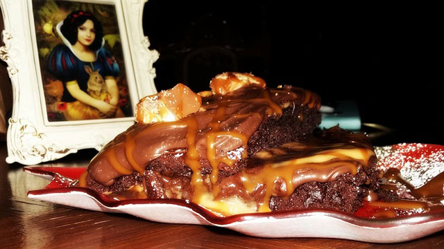 Μπήκαμε και η Βανέσα, ιδιοκτήτρια (μαζί με τον άντρα της) του μαγαζιού μας έβαλε να καθίσουμε σε ένα μεγάλο τραπέζι, μαζί με μια άλλη παρέα. Πίσω μου ήταν η ένα τζάκι που μέσα του είχε ένα καλάθι με μήλα και μια κακιά μάγισσα από πάνω. Λίγο πιο κει ένας μονόκερως έβγαινε από τον τοίχο. Ένας δράκος δίπλα στο μπαρ. Ο καθρέφτης της μητριάς της Χιονάτης. Μουσική τύπου epic σάουντρακ, όπως παρατήρησε η Λένα. Ο σερβιτόρος ο Παναγιώτης συμπαθέστατος. Α για το γλυκό δεν σας είπα. Dark Twix Delight, δηλαδή ζουμερό σοκολατένιο κέικ, γεμισμένο με παχύρευστη καραμέλα βουτύρου, πραλίνα σοκολάτας, μπισκότο και ολόκληρα κομμάτια Twix, δηλαδή ένα εκατομμύριο θερμίδες.