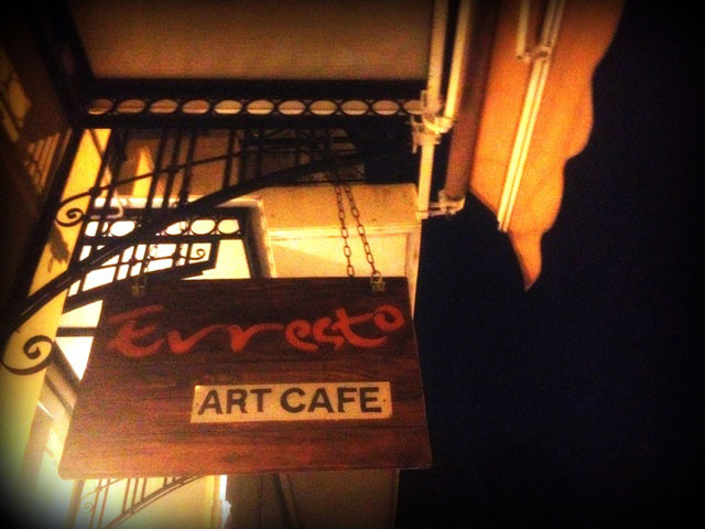 Και τώρα Ernesto Art Café. Με το όνομά του εμπνευσμένο από τον Τσε τον Γκεβάρα. Ναι. Το επαναστατικό αυτό καφέ δημιουργήθηκε από τους ιδιοκτήτες του γιατί τους άρεσαν τα ταξίδια και οι αφηγήσεις, η φιλοξενία και οι ιστορίες. Εκείνοι μου το είπαν, δεν το λέω εγώ. Είναι ο Παντελής και ο Θεοδόσης. Ο Θεοδόσης ήταν εκεί, όταν πήγαμε και ήταν σε φάση χαμού. Αλλά παρόλα αυτά τα είπαμε λίγο. Το μαγαζί ήταν ασφυκτικά γεμάτο, με παρέες που έπιναν μπίρες και τσίπουρα και η ώρα ήταν ακόμη 11.30, συνήθως το πάνε μέχρι 5 ή 7 τα ξημερώματα.
