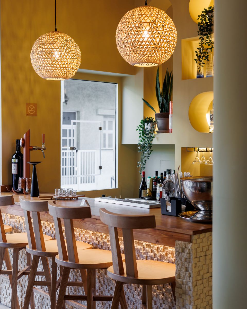 Η σάλα του Acan Restaurant με τη γήινη αισθητική είναι δημιουργία του Γιώργου Σμυρλή και θυμίζει μια μικρή ζούγκλα, με minimal boho διάθεση, ενώ το ιδιαίτερο bar και το ψηφιδωτό ταβάνι σε συνδυασμό με την διακόσμηση του χώρου δημιουργούν μια όμορφη ατμόσφαιρα.