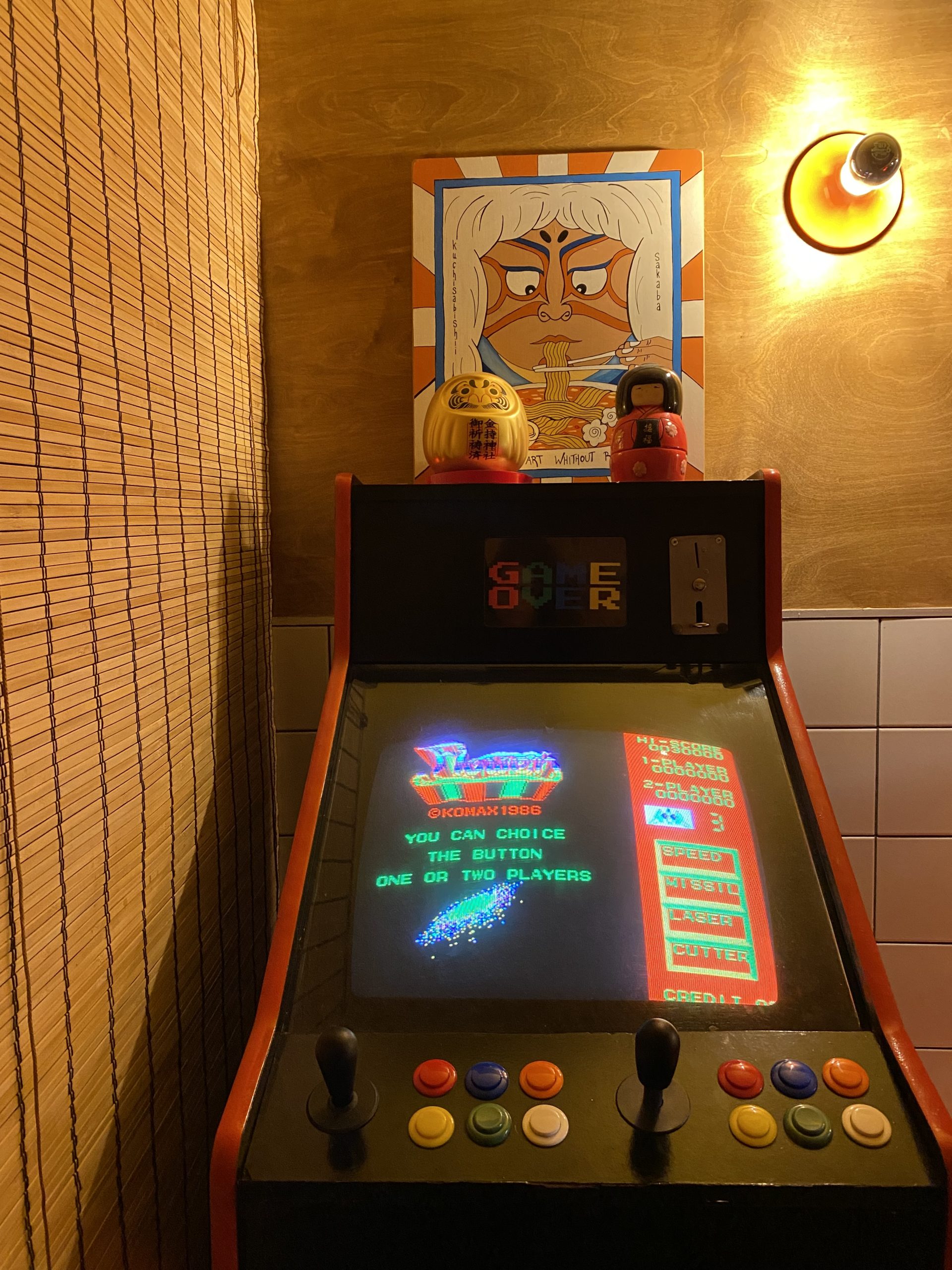 Ο χώρος έχει έντονες αισθητικές αναφορές στη Yokohama της δεκαετίας του ’80. Η μεταλλική σκεπή πάνω από την ανοιχτή κουζίνα θυμίζει τα γρήγορα ramen shops και fast-food spots της Ιαπωνίας, ενώ η περιοχή της αναμονής, με τα χαρακτηριστικά πλακάκια στους τοίχους, παραπέμπει στις αποβάθρες του ιαπωνικού μετρό. Η πέργκολα ολοκληρώνει το σκηνικό με μια ατμόσφαιρα που θυμίζει τις ιαπωνικές pubs, δημιουργώντας μια εμπειρία που μοιάζει σαν μικρό αστικό στιγμιότυπο από την Ιαπωνία. Πριν μπεις στην τουαλέτα, είναι πολύ πιθανό να σταθείς στο ηλεκτρονικό παιχνίδι, τύπου φλιπεράκι, και να παίξεις έναν γύρο.