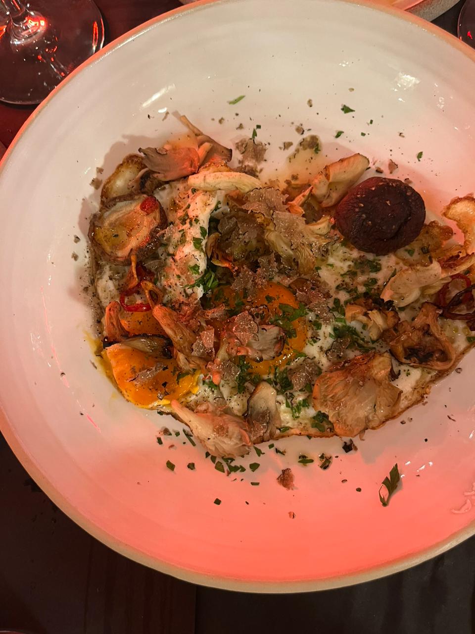 Τελευταία ήρθαν τα Μανιτάρια στη ρομπάτα, με αβγά μάτια και καλοκαιρινή τρούφα. Ένα έντονο, πολύ νόστιμο πιάτο, αλλά ίσως λίγο βαρύ για καλοκαίρι. Αξίζει να σημειωθεί ότι, αν είσαι λάτρης της τρούφας, ο συνδυασμός των υλικών θα σου αρέσει πολύ.