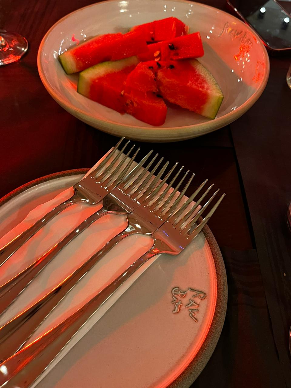Το γεύμα ολοκλρώθηκε με καρπούζι κομμένο σε φέτες, ώστε να μπορείς να το πιάσεις με το χέρι. Ο σεφ μας ενημέρωσε αργότερα πως αυτός ήταν και ο στόχος.