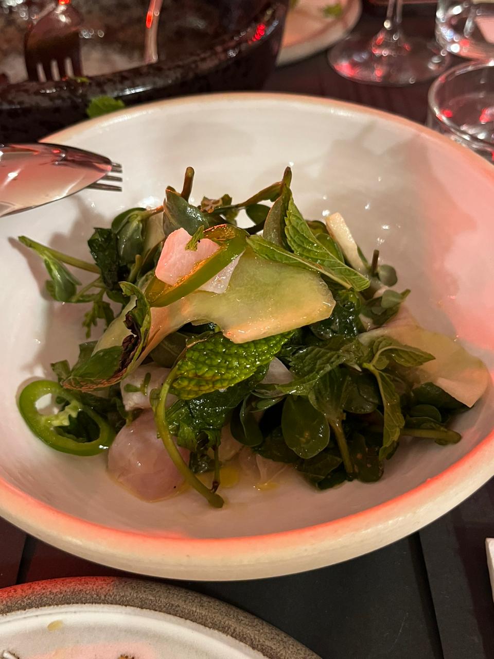 Ακολούθησε το Σεβίτσε Κέφαλου με γλιστρίδα, ξυλάγγουρο, αρωματικά και χαλαπένιο, ένα δροσερό και όξινο πιάτο, στο οποίο υπερίσχυε ο δυόσμος, που ήταν ό,τι έπρεπε για ένα ζεστό καλοκαιρινό βράδυ.