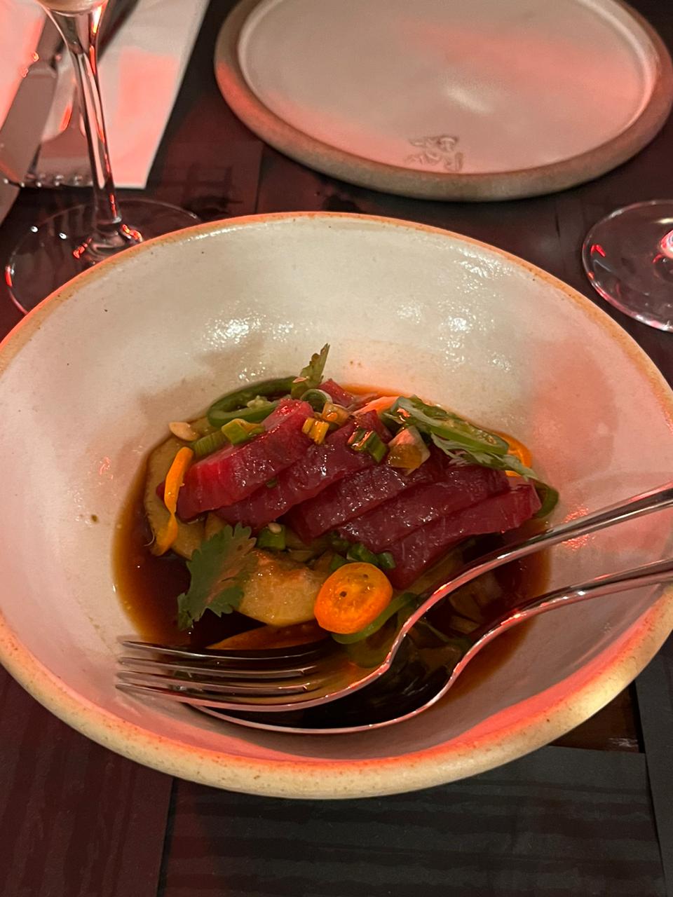 Ξεκινήσαμε με Σασίμι ντάσκας με σόγια, κουμκουάτ και φρέσκο κρεμμύδι. Ένα πολύ καλά φιλεταρισμένο και καθαρισμένο ψάρι, με έντονη τη γεύση της σόγιας που αντισταθμιζόταν από το κουμκουάτ, το οποίο είχε πάρει μια μορφή και σύσταση σαν τουρσί. Το αποτέλεσμα; Ωραίες ισορροπίες μεταξύ γλυκού και αλμυρού στοιχείου στο πιάτο.
