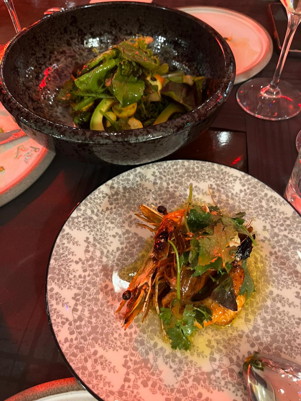 Στη συνέχεια ήρθαν οι Ψητές Γαρίδες με σαλάτα μεσκλάν, ψημένα καρότα, πίκλα αγκινάρα και γιούζου κόσο. Η σαλάτα ήταν ιδιαίτερα αρωματική, σίγουρα, όμως, πρωταγωνιστής του πιάτου ήταν οι γαρίδες (με τα κεφάλια αλλά καθαρισμένο σώμα), καλοψημένες, μελωμένες και μαλακές, άφηναν μια ευχάριστη καπνισμένη επίγευση.