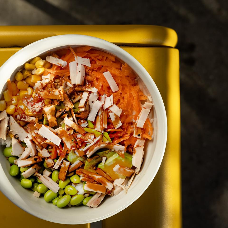 Ο σεφ σκέφτηκε το Poke Bowl με τον δικό του τρόπο. Κράτησε το ελαφρώς γλυκό και «sticky» sushi rice, τα τρυφερά και χορταστικά edamame beans με την ιδιαίτερη γεύση, προσέθεσε φρέσκο τριμμένο καρότο και γλυκό καλαμπόκι και, για να γίνει το salad bowl ένα πραγματικά ολοκληρωμένο γεύμα, διάλεξε ως πηγή πρωτεΐνης παστράμι γαλοπούλα.