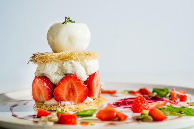 Όταν προσγειώθηκε στο τραπέζι η σαλάτα, έπεσε σιωπή. Μία σαλάτα με φρέσκια μυζήθρα, φράουλες σορμπέ λαδολέμονο με θυμάρι σε τραγανό κανταΐφι, ήταν ένα υπερθέαμα. Και για τα μάτια, και για τον ουρανίσκο.