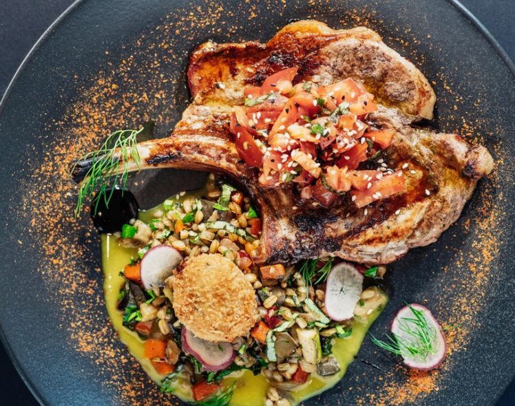 Επόμενη δοκιμή, ένα τελείως καλοκαιρινό πιάτο, το χοιρινό μπριζολάκι από τη Σχοινούσα το οποίο συνοδεύεται από ριζότο με στάρι και φαγόπυρο και ένα μπριάμ λαχανικών με σάλτσα πορτοκάλι και φρέσκια ντομάτα με βασιλικό.