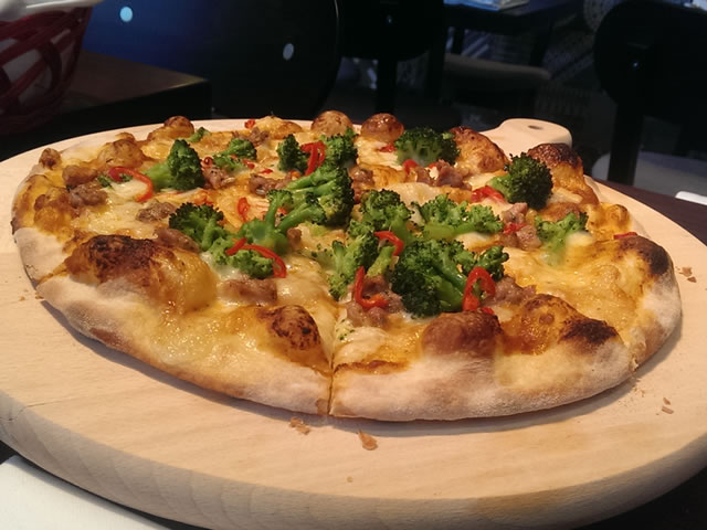 Πίτσα από ξυλόφουρνο. Η τυπική συνοικιακή (στον Άλιμο), η αφράτη, με το λίγο-λάδι-παραπάνω σε σχέση με αυτές από τις γνωστές αλυσίδες. Αποκλειστικά για καλοφαγάδες, για αυτούς που προτιμούν τις πιο έντονες γεύσεις, που δεν λογαριάζουν το ένα κομμάτι παραπάνω και μετράνε τις πίτσες σε… πίτσες και όχι σε κομμάτια. Σταθερή αξία η ομόνυμη: σάλτσα ντομάτας, ένταμ, μοτσαρέλο, ζαμπόν, μπέικον, μανιτάρια, πιπεριά, πεπερόνι, σαλάμι. Απλή, λιτή, δωρική.