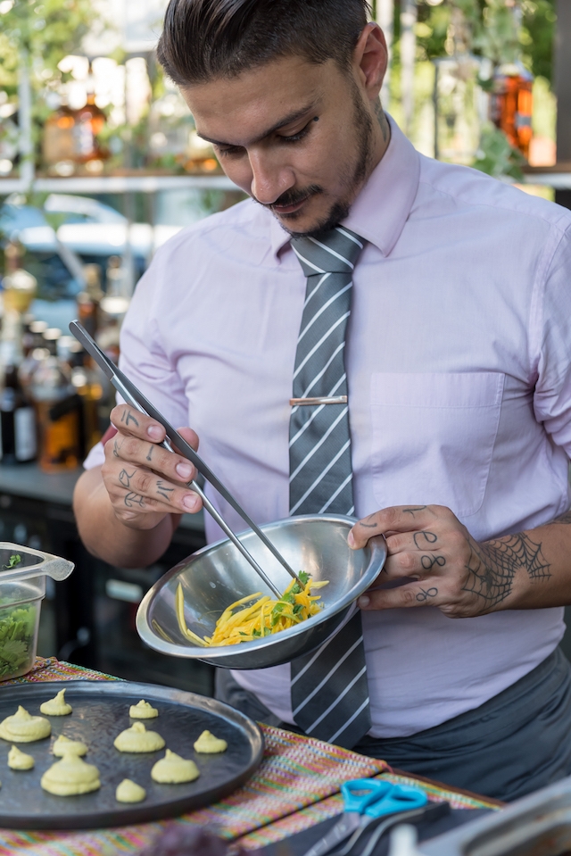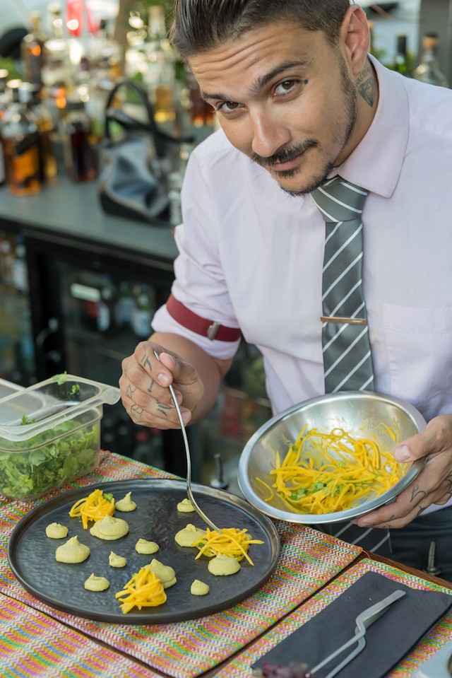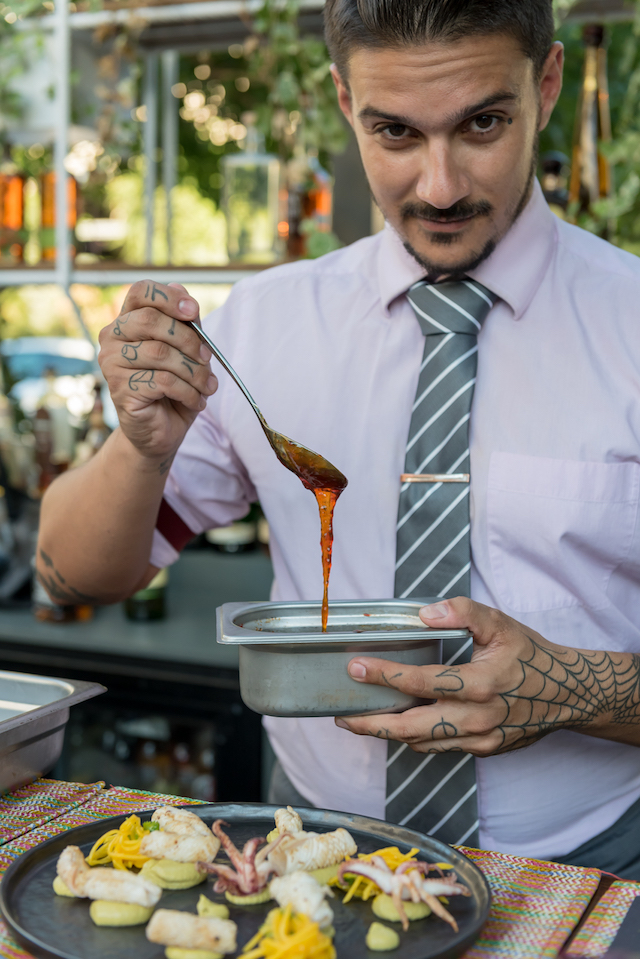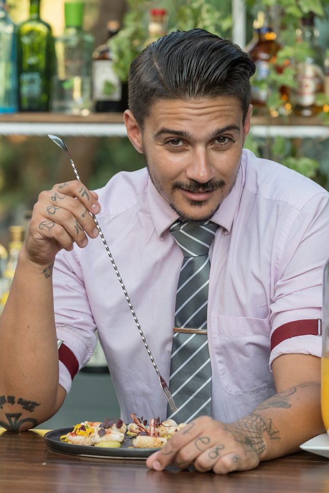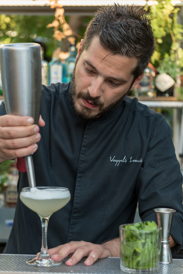 Αφού τους γνωρίσαμε από έξω προς τα μέσα, ήρθε η ώρα να τους αλλάξουμε θέση. Έτσι, βάλαμε τον Τέο να μας κάνει καλαμάρι τηγανιτό με αβοκάντο, μάνγκο και καυτερή σάλτσα και τον Βαγγέλη ένα ασιατικό κοκτειλ, το East Asia Martini. Σύμφωνα με τον Τέο, «Ένας bartender με έναν σεφ έχουν πάρα πολλά κοινά σημεία. Το κομμάτι της δημιουργίας όπως είναι στην κουζίνα έτσι είναι και στο μπαρ, δηλαδή ένας επαγγελματίας bartender δεν αγοράζει έτοιμα υλικά αλλά κάθεται και τα μαγειρεύει. Γι’ αυτό πολλές φορές μπορεί να δεις κάποιους bartender να μπαίνουν στην κουζίνα και να φωνάζει ο σεφ και να ουρλιάζει γιατί ο ένας παίρνει πράγματα από τον άλλον, να μπαίνει ο ένας στον χώρο του άλλου. Και οι δύο έχουμε προετοιμασία, και οι δύο πρέπει να έχουμε έτοιμες γαρνιτούρες και φυσικά, πρέπει να γνωρίζουμε πάρα πολύ καλά τα υλικά μας, έτσι ώστε να είμαστε έτοιμοι να εφαρμόσουμε τις τεχνικές που έχουμε μάθει ανα πάσα στιγμή, γιατί δεν ξέρεις ποτέ τι θα σου έρθει και τι θα χρειαστεί να κάνεις, ή ακόμη και σε κάποιες αναποδιές”.