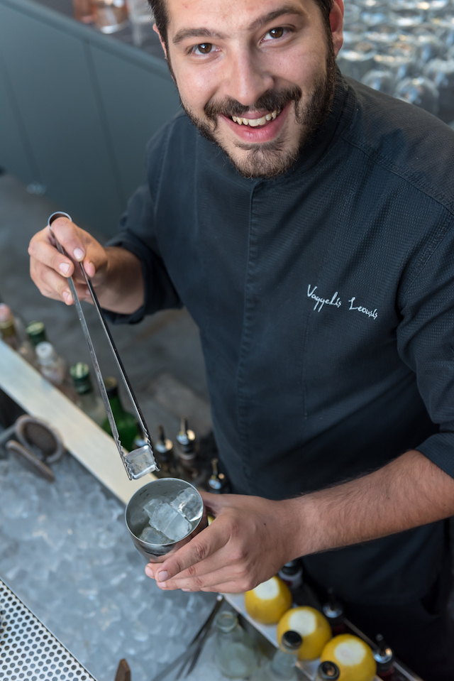 Για την επόμενη μισή ώρα λοιπόν, επικράτησε μια κατάσταση σουρεάλ. Ο ένας μέσα στα πόδια του άλλου, να προσπαθεί να κάνει κάτι που δεν το είχε ξανακάνει ποτέ. Ειδικά στον χώρο εργασίας τους. Ο Τέο είχε προτείνει εξ΄αρχής το East Asia Martini για τον Βαγγέλη. Ένα κοκτειλ που ταιριάζει με θαλασσινά συνήθως συνδυάζεται ωραία με ασιατικά υλικά, σα το uzu. “Χρειάζεται μαγείρεμα και έχει μια ιδιαιτερότητα. Το σιρόπι ginger και η πάστα από lemon grass την οποία την κάνουμε αφρό και την προσθέτουμε στο cocktail”. Από την άλλη, ο Βαγγέλης μόλις δοκίμασε το κοκτέιλ του ήθελε να βάλει τον Τέο να του κάνει λαβράκι με pudding μήλου. Δεν τα κατάφερε ποτέ μα επίσης, θα ταίριαζε τέλεια.