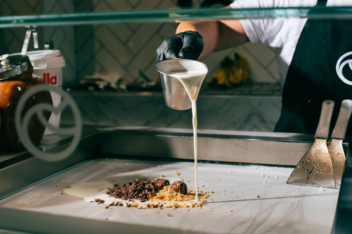 Αρκεί μια παγωμένη επιφάνεια, πάνω στην οποία έμπειροι τεχνίτες αναμειγνύουν φρέσκο γάλα, που καταφτάνει από τον συνεταιρισμό “ΘΕΣγάλα” κάθε δυο μέρες ή γάλα καρύδας και αμυγδάλου για τους vegans με φρέσκα φρούτα εποχής και superfoods από Έλληνες παραγωγούς ή αγαπημένες σοκολάτες και μπισκότα (τα αυθεντικά, όχι απομιμήσεις).