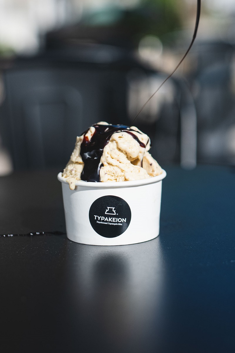 Όταν βρίσκεσαι σε ένα γαλακτοπωλείο που είναι γνωστό ότι έχει πολύ καλό γιαούρτι, δεν μπορείς να μην δοκιμάσεις και το αντίστοιχο παγωτό. Στο Τυράκειον λοιπόν, το παγωτό γιαούρτι γίνεται με το δικό τους κατσικίσιο γάλα και θυμαρίσιο μέλι από το νησί και σε κερδίζει με την γεμάτη γεύση του. Εξίσου δυνατό και το παγωτό ρυζόγαλο, ενώ για εσένα που ο καφές είναι η μεγάλη σου αγάπη, τσέκαρε τη γεύση εσπρέσο.