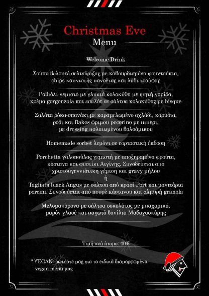 Το μενού ξεκινά με βελουτέ σελινόριζας με καβουρδισμένα φουντούκια, chips καπνιστής πανσέτας και λάδι τρούφας. Στη συνέχεια, στο γιορτινό τραπέζι φτάνει το γεμιστό ραβιόλι με γλυκιά κολοκύθα, ψητή γαρίδα, κρέμα gorgonzola και εσαλότ σε σάλτσα κολοκύθας με bisque ενώ ο πρώτος γευστικός κύκλος της βραδιάς κλείνει με σαλάτα ρόκα σπανάκι με καραμελωμένο αχλάδι, καρύδια, ρόδι και flakes ώριμου pecorino με πιπέρι, με dressing παλαιωμένου βαλσάμικου. Ένα homemade sorbet λεμόνι σε εορταστική έκδοση θα προετοιμάσει το έδαφος για το κυρίως: Επιλογή ανάμεσα σε porchetta γαλοπούλας γεμιστή με αποξηραμένα φρούτα, κάστανα και φυστίκι Αιγίνης που συνοδεύεται από χριστουγεννιάτικη γέμιση και gravy μήλου ή tagliata black angus με σάλτσα από κρασί Port και μανιτάρια porcini, που συνοδεύεται από πουρέ κάστανου και αλμυρή granola. Για το κλείσιμο, μελομακάρονα με σάλτσα σοκολάτας με μπαχαρικά, μαρόν γλασέ και παγωτό βανίλια Μαδαγασκάρης.