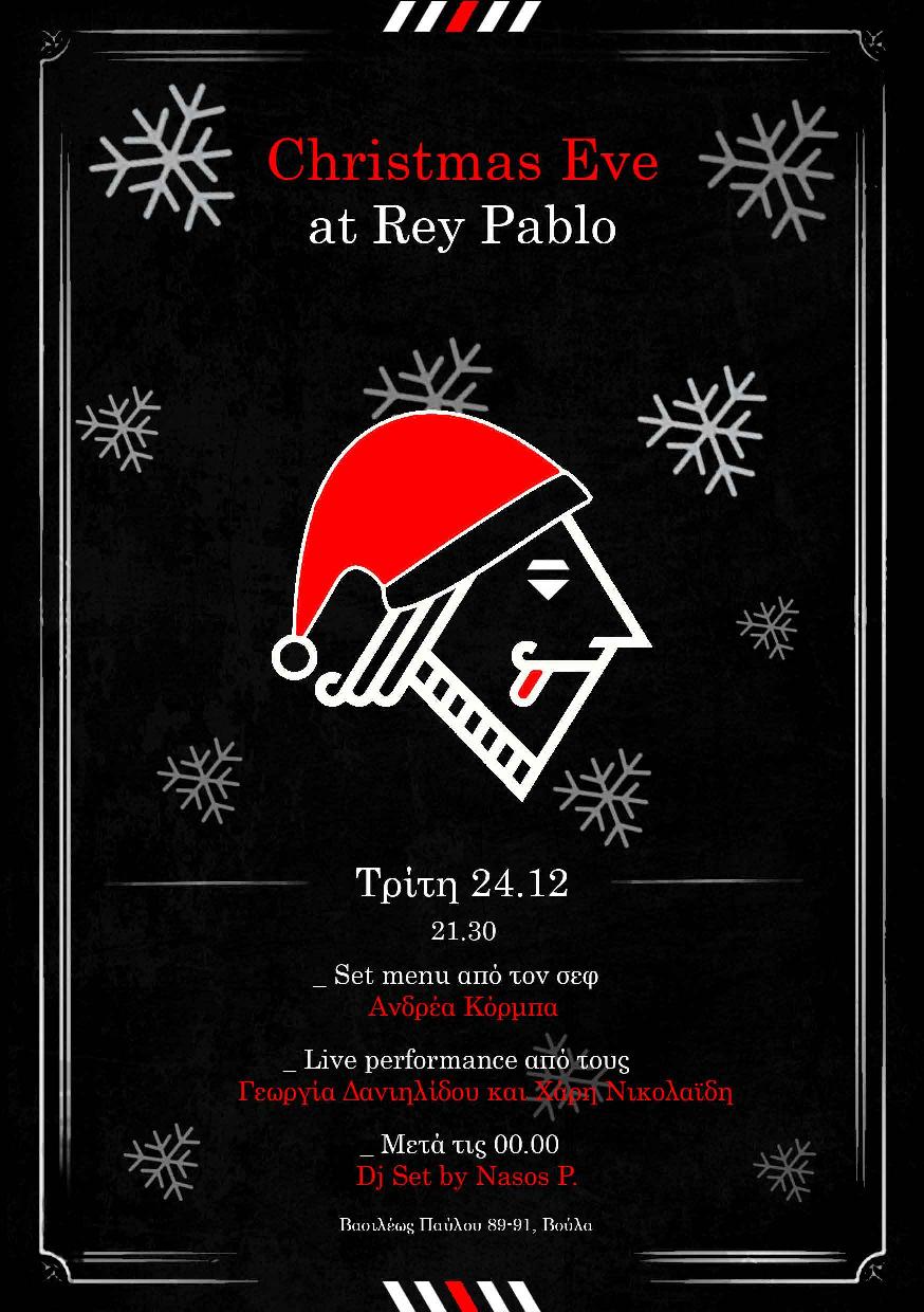 Την Παραμονή των Χριστουγέννων το Rey Pablo μας περιμένει με set menu (και σε vegan εκδοχή) από τον σεφ Ανδρέα Κόρμπα, live performance από τους Γεωργία Δανιηλίδου και Χάρη Νικολαΐδη και, μετά τα μεσάνυχτα, DJ set by Nasos P.