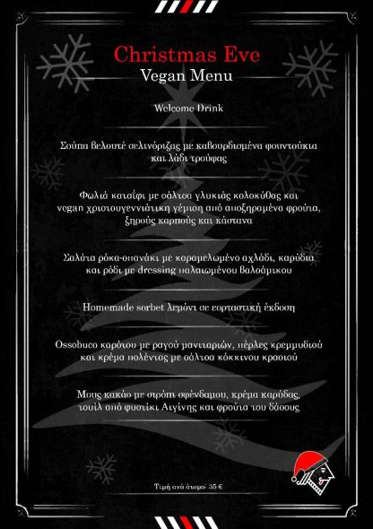 Παράλληλα, το vegan menu ξεκινά με βελουτέ σελινόριζας με καβουρδισμένα φουντούκια και λάδι τρούφας και συνεχίζει με φωλιά καταΐφι με σάλτσα γλυκιάς κολοκύθας και vegan χριστουγεννιάτικη γέμιση από αποξηραμένα φρούτα, ξηρούς καρπούς και κάστανα. Ακολουθεί η σαλάτα ρόκα σπανάκι με καραμελωμένο αχλάδι, καρύδια και ρόδι, με dressing παλαιωμένου βαλσάμικου και το σπιτικό sorbet λεμόνι σε εορταστική έκδοση. Για κυρίως, ο σεφ προτείνει ossobuco καρότου με ραγού μανιταριών, πέρλες κρεμμυδιού και κρέμα πολέντας με σάλτσα κόκκινου κρασιού ενώ το επιδόρπιο είναι μους κακάο με σιρόπι σφένδαμου, κρέμα καρύδας, τουίλ από φυστίκι Αιγίνης και φρούτα του δάσους.