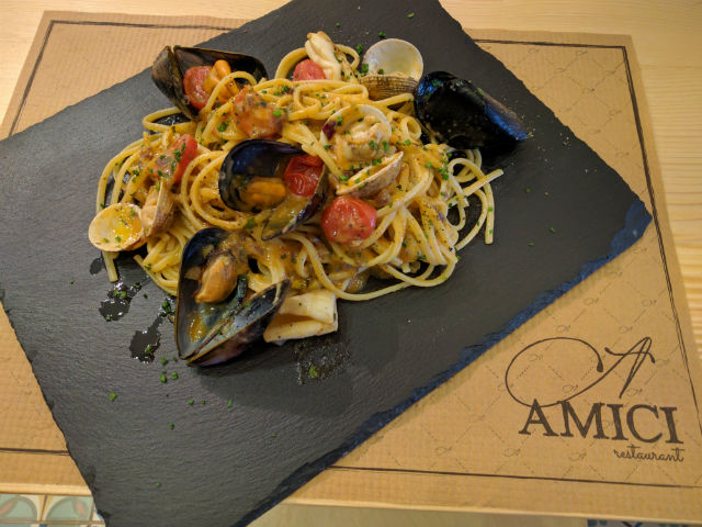 Οι μακαρονάδες έχουν την τιμητική τους εδώ, αφού η pasta «πετάει ψηλά», σε κρεατοφαγική (στριφτάρια με μοσχαράκι ραγού που «λιώνει») αλλά και ψαροφαγική βερσιόν (λιγκουίνι με καλαμάρι, μύδια, κυδώνια και μπισκ). Όσο για τα κυρίως, όλα είναι άψογα ισορροπημένα μεταξύ τους και μαγειρεμένα με τον πιο εκλεπτυσμένο τρόπο. Από την πανσέτα sous- vide, μέχρι τον μπακαλιάρο σωτέ. Και όποιος νομίζει ότι θα πρέπει να πληρώσει αδρά για να απολαύσει το φαγητό του Amici- αν και πραγματικά αξίζει- καλό θα ήταν να γνωρίζει πως το πιο ακριβό πιάτο του μενού αγγίζει τα 13 ευρώ, με τα περισσότερα να κυμαίνονται σε μονοψήφια νούμερα τιμών.