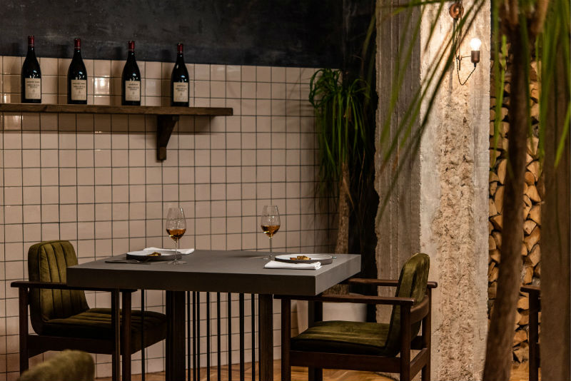 Ανοίγοντας τη μεταλλική πόρτα με το ειδικό κλειδί, ξεπροβάλει ένας industrial χώρος με αναφορές από τα 70’s και old school αισθητική. Κολώνες από τσιμέντο, λευκά πλακάκια, ένα ψυγείο ωρίμανσης κρεάτων, στoιβαγμένα ξύλα και μια ιδιότυπη κάβα πλαισιώνουν τα λιγοστά τραπέζια του εστιατορίου, ενώ πίσω από τη μεγάλη τζαμαρία με τον μεταλλικό σκελετό δεσπόζει η ανοιχτή κουζίνα από όπου διαχύεται μια προκλητική καπνιστή μυρωδιά. Στο εσωτερικό της πρωταγωνιστούν οι σχάρες και οι ανοιχτές φωτιές, αφού όλα ψήνονται στο ξύλο, ενώ το καπνιστήριο και η sous vide τεχνολογία μαρτυρούν την αδυναμία του chef στις δημιουργικές τεχνικές.