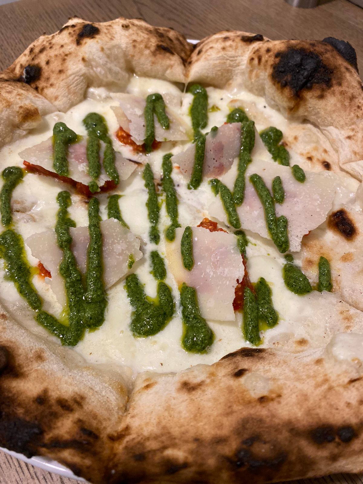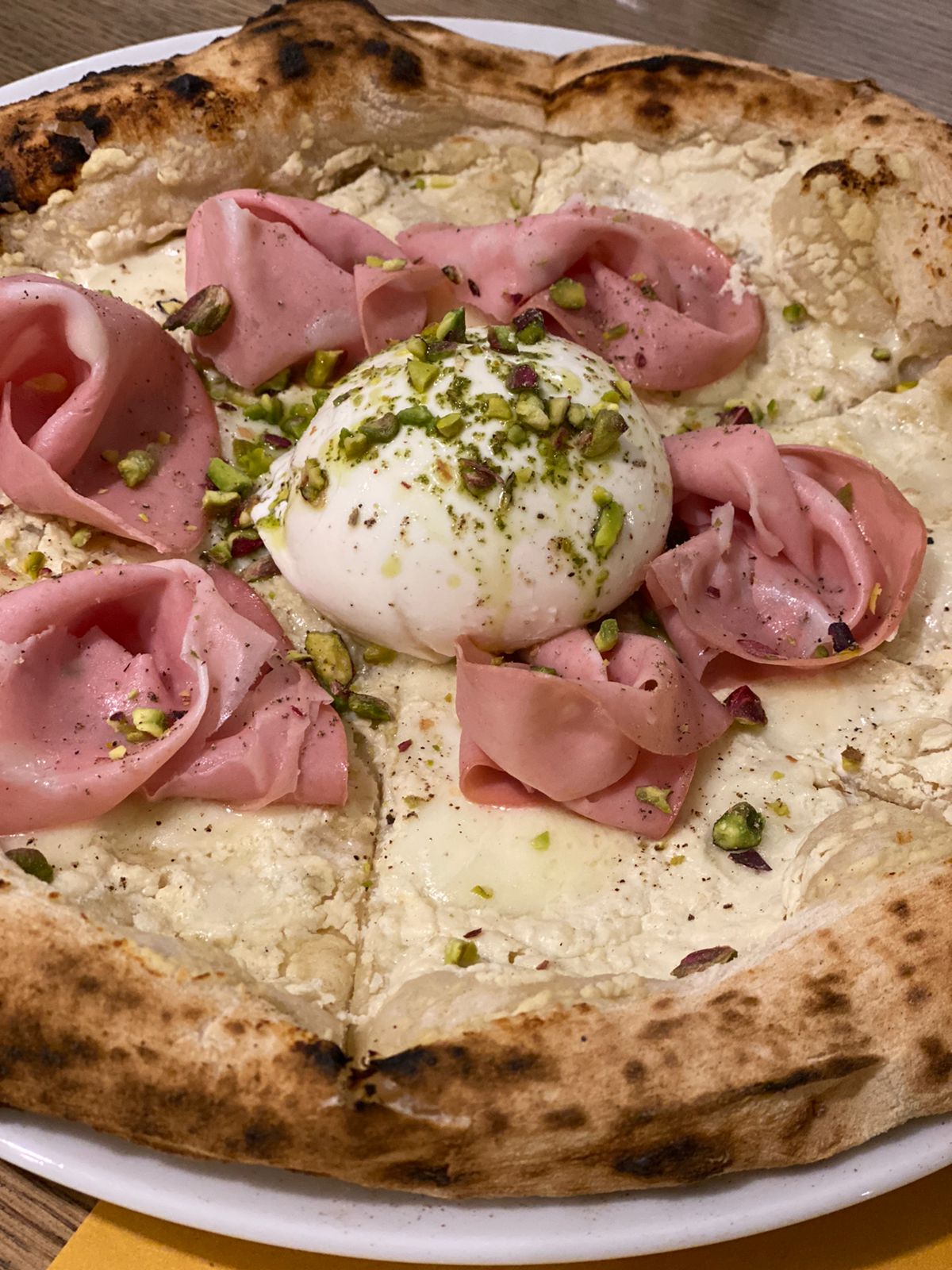 Εγώ δοκίμασα την Margherita με σάλτσα ντομάτας, μοτσαρέλα, βασιλικό και ελαιόλαδο στην οποία το ζυμάρι είναι απόλυτος πρωταγωνιστής. Επίσης πήρα την πανέμορφη Burrata, με μπουράτα, μορταδέλα και φιστίκι, η οποία έμοιαζε να βγήκε από τα πιο τρελά όνειρα του λάτρη της μορταδέλας. Τέλος, ευχάριστη έκπληξη ήταν η επίσης λευκή με πατέ ντομάτας, πέστο βασιλικού και τυρί Rezzana τριαντάμηνης ωρίμανσης του Ιδρύματος Tοσίτσα. Μπορεί να σου είπα μόλις ότι είναι λευκή, αλλά το πατέ ντομάτας δίνει όλη αυτή την ουμάμι γεύση που χρειάζεται η πίτσα και το αποτέλεσμα είναι εντυπωσιακό.