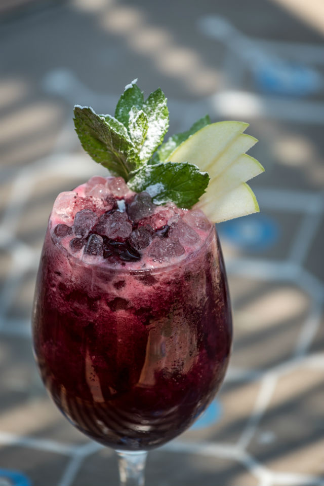 Συστατικά: Gordon’s Gin, blackberries, λικέρ από πράσινο μήλο, λάιμ.