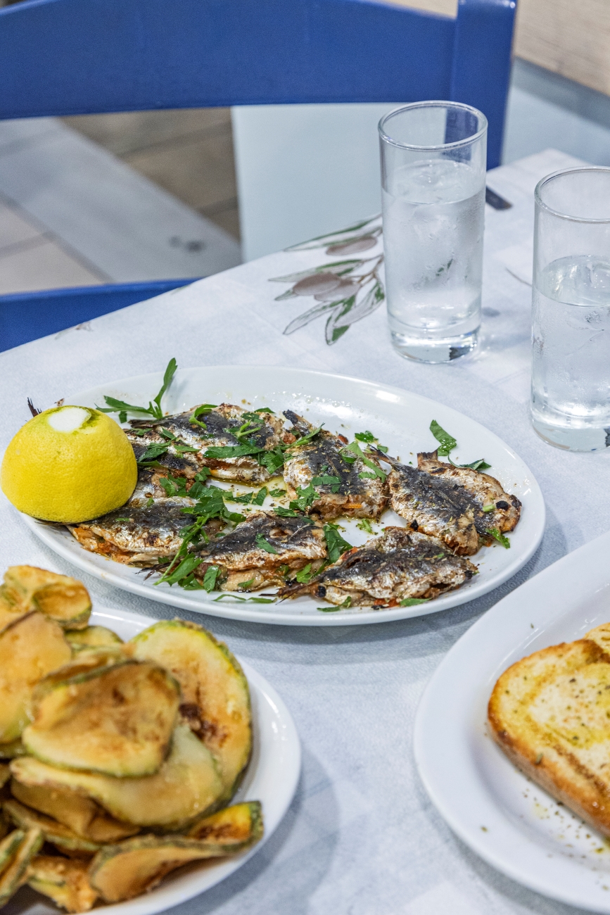 Η σαρδέλα έρχεται στο τραπέζι φιλεταρισμένη, γεμιστή με ψιλοκομμένα λαχανικά, (ντομάτα, κρεμμύδι, σκόρδο, μαϊντανό). «Είναι ένας πολύ καλός μεζές που σπάνια λείπει από παραγγελία». Καθώς έχω ιδιαίτερη αδυναμία σε αυτό το ταπεινό ψαράκι, δοκιμάζω κι επιβεβαιώνω ότι αυτή η ψητή σαρδέλα είναι από τις πιο νόστιμες που έχω γευτεί και σίγουρα ένα από τα πιάτα που θα ζητούσα και δεύτερη μερίδα.