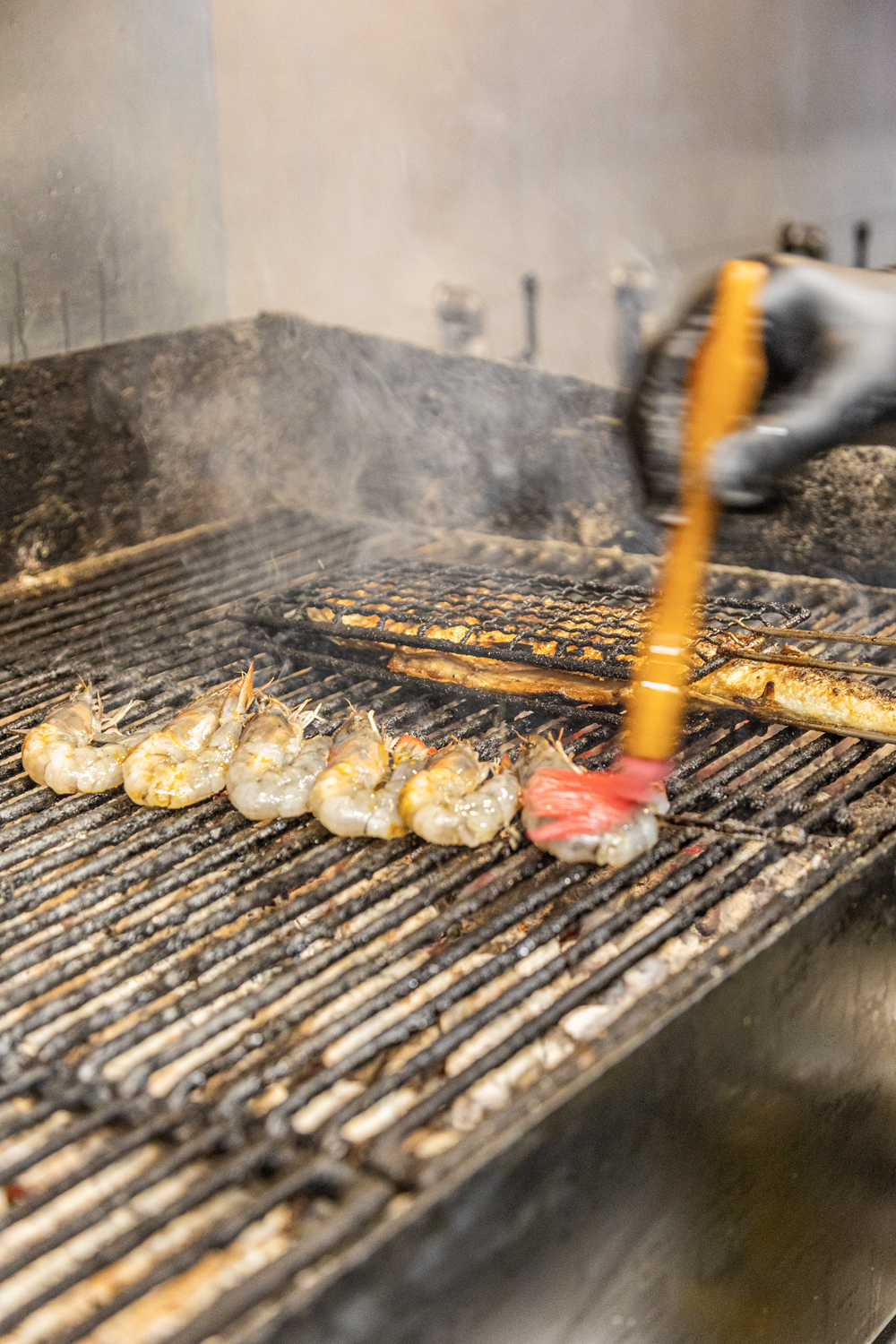 «Οι ψητές γαρίδες είναι μια από τις σπεσιαλιτέ μας κι ένα από τα πιο αγαπημένα πιάτα μικρών και μεγάλων» παραδέχεται ο κ. Βασίλης. «Πολύ λίγες φορές έχω δει να έχουν μείνει γαρίδες στο πιάτο, συνήθως εξαφανίζονται όλες». Καθώς έρχεται μια περιποιημένη μερίδα στο τραπέζι, επιβεβαιώνω πως είναι ένα πιάτο ιδιαίτερα νόστιμο. Σωστά ψημένες και ζουμερές, ακριβώς όπως πρέπει. Όταν τον ρωτάω για τη μαρινάδα στις γαρίδες, σχεδόν βάζει τα γέλια. «Όλοι με ρωτάνε για αυτή τη μαινάδα, ακόμη και επαγγελματίες σεφ. Σε όλους λέω το ίδιο, θέλετε το πιστεύετε ή όχι, τίποτε δεν έχουν οι γαρίδες, μόνο λαδολέμονο και αλάτι. Όλη η νοστιμιά βγαίνει από το ψήσιμο στο κάρβουνο, τίποτε άλλο».