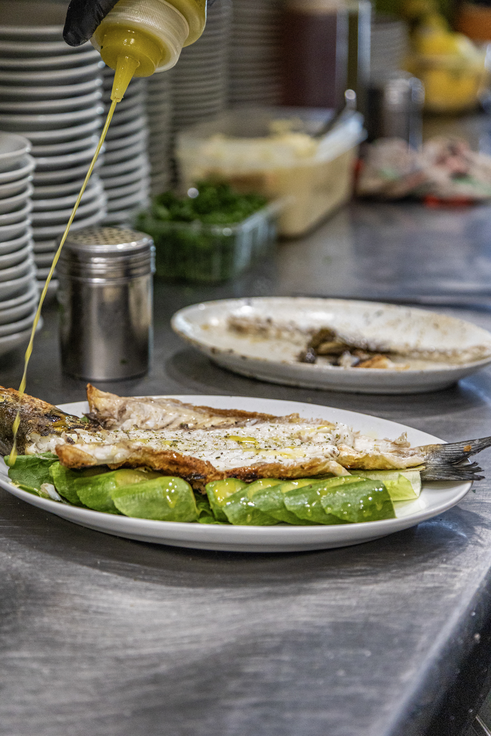 «Στο Μπακαλιαράκι προσέχουμε πολύ το λάδι που χρησιμοποιούμε. Ήταν και η συμβουλή που μου είχε δώσει ένα παλιός επαγγελματίας στη γειτονιά: “Βασίλη, να προσέχεις το λάδι, όλοι αγαπούν τα τηγανητά, κανείς δεν θέλει τις καούρες μετά”. Η αλήθεια είναι ότι στη διάρκεια του σέρβις αλλάζουμε το λάδι σε κάθε δυο με τρία τηγάνια, καταναλώνουμε περισσότερο από 500 λίτρα ηλιέλαιο την βδομάδα. Τα ψάρια τα τηγανίζουμε μόνο στο τηγάνι κι όχι σε φριτέζα για πρακτικούς λόγους. Στο τηγάνι είναι εύκολο με μια κίνηση να χύσεις και να αλλάξεις το λάδι που τηγάνισες, στην επαγγελματική φριτέζα είναι ολόκληρη διαδικασία, παίρνει πολύ χρόνο και δεν είναι καθόλου εύκολο όταν έχεις κόσμο να σερβίρεις» εξηγεί ο κ. Βασίλης και σκέφτομαι πώς έχει δίκιο, το τηγάνι είναι πιο γρήγορο και πιο καθαρό από τη φριτέζα.